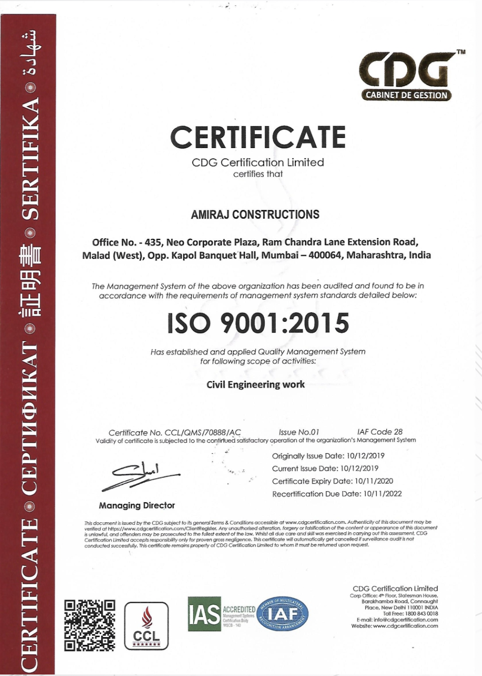 Certified to be compliant with the following standards in respect of Engineering, Procurement, and Construction Contract for Building Construction: